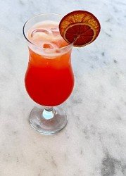 Whisky, hibiscus, passionfruit, lemon juice and orange juice