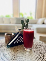 Vodka, peach syrup, rose water, orange juice and hibiscus juice