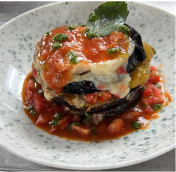 Grilled eggplant . Fresh tomato sauce . mozzarella .basil and parmesan