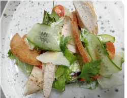 Romaine lettuce, Cesar dressing, parmesan cheese, crouton, grilled chicken breast