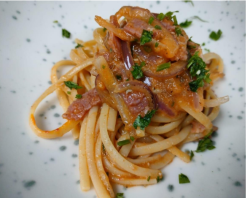 Beef Bacon, Onion, Tomato Sauce And Parmesan
