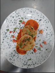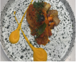 Mushroom, peas and carrots served with parmesan sauce and tomato confit