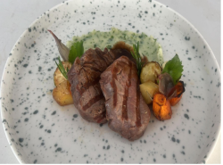 Beef Medallion served with Mashed potatoes. Cherry tomato. Rosted Vegetables Mushroom Sauce