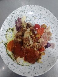 Parmesan breaded chicken breast, tomato sauce, smoked beef, mixed bell peppers, mushrooms, mashed potatoes