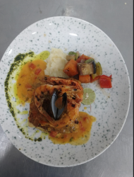 Fillet Fish, celery, olives, cherry tomato, mussels and shrimps with puttanesca sauce