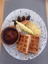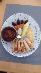 Choise of Toppings white sugar, chocolate sauce, cinnamon sugar, honey, caramel sauce, fruit sauce, fresh fruits slices, jam.