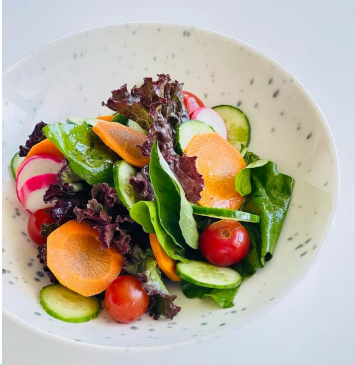 Mix leaves salad, sliced vegetables, tomatoes, olive oil, balsamic
