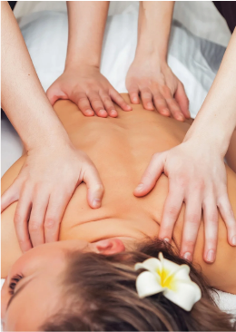 Two therapists work together in a synchronized harmony, applying a combination of sensuous strokes and muscle manipulation using aromatic oils on the body.